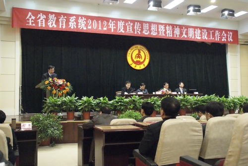 省委教育工委副书记、省教育纪工委书记郝利生出席会议并讲话,他强调指出,各地各学校要按照《2012年精神文明建设和宣传思想工作任务书》的安排和部署,结合实际,重点做好九方面的工作:一是努力为党的十八大胜利召开营造良好氛围;二是大力推进理论武装工作;三是切实加强青年教师思想政治工作;四是以社会主义核心价值体系为引领,切实加强大学生思想政治教育和未成年人思想道德教育;五是加强和改进大学文化建设,积极创建文明校园;六是以开展学习雷锋活动为重点,深入推动志愿服务工作;七是加强新闻宣传工作,提高舆论引导水平;八是突出典型引路;九是抵御宗教非法渗透,防范校园非法传教。
