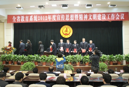 会上对被命名授予为全省教育系统2011年度精神文明建设和宣传思想工作的先进集体、先进个人颁发奖牌和荣誉证书,我院体育教育系被授予“先进集体”称号,我院党政办主任陈彦作为先进个人代表上台领奖。